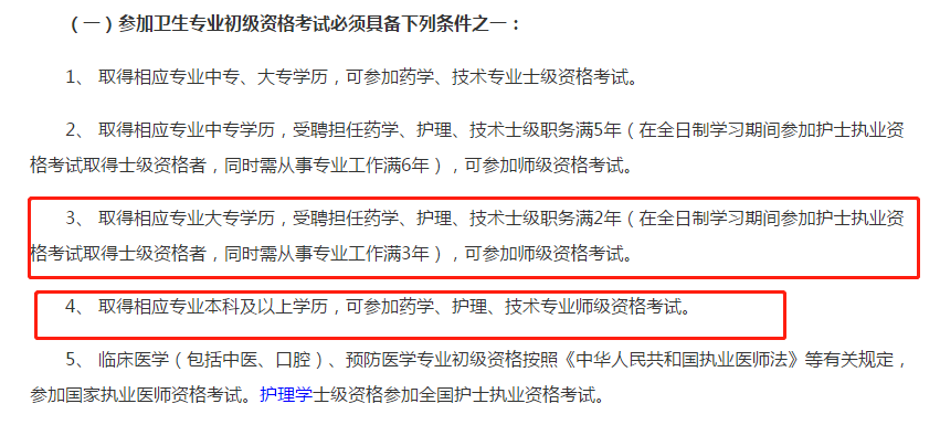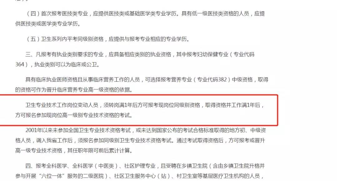 2、因工作崗位變動,需報考現(xiàn)崗位專業(yè)類別的人員,其從事現(xiàn)崗位專業(yè)工作時間須滿兩年。藥、護、技三類,同類之間的專業(yè)可以改報;藥、護、技三類之間互改,需取得報考現(xiàn)崗位專業(yè)規(guī)定學歷,從初級開始報考,改報護理類須具備執(zhí)業(yè)護士資格;臨床醫(yī)學類可以改報藥、技類,改報護理類須具備執(zhí)業(yè)護士資格;臨床醫(yī)學類由原執(zhí)業(yè)注冊專業(yè)改報現(xiàn)崗位專業(yè),其從事現(xiàn)崗位專業(yè)工作時間,應從執(zhí)業(yè)注冊變更后開始計算。